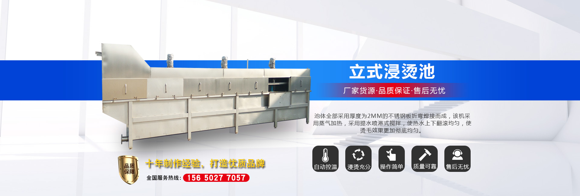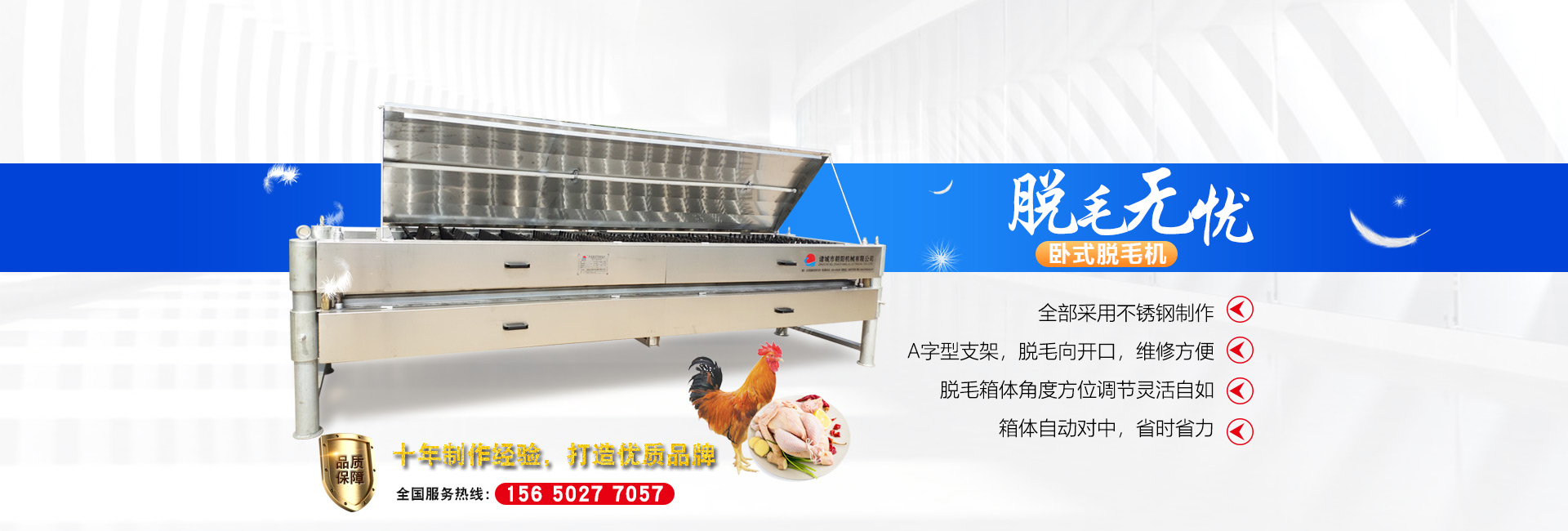 公司長期與國內(nèi)外屠宰加工企業(yè)合作,走引進(jìn)——消化——?jiǎng)?chuàng)新和自主研發(fā)相結(jié)合的道路,在國內(nèi)外同類產(chǎn)品的基礎(chǔ)上,不斷更新和改造。公司主要設(shè)備有:A字型立式脫毛機(jī)、臥式脫毛機(jī)、強(qiáng)力噴淋機(jī)、松毛機(jī)、浸燙池、螺旋預(yù)冷機(jī)、禽籠清洗機(jī)、電暈機(jī)、兔扯皮機(jī)、兔割前爪/后爪機(jī)、剝胗機(jī)、自動(dòng)洗鉤機(jī)、螺旋燙爪機(jī)、雞爪脫皮機(jī)、分割輸送帶等屠宰用設(shè)備。其中,公司獨(dú)力發(fā)明生產(chǎn)設(shè)計(jì)的“電動(dòng)調(diào)節(jié)脫毛機(jī)”及“自動(dòng)控水控溫浸燙池”順利通過知識產(chǎn)權(quán)局的實(shí)質(zhì)性審查。公司所生產(chǎn)的設(shè)備 可與國外同類產(chǎn)品配套使用,設(shè)備遠(yuǎn)銷阿爾及利亞、澳大利亞等中東、非州等并建立了長期穩(wěn)定的合作關(guān)系。